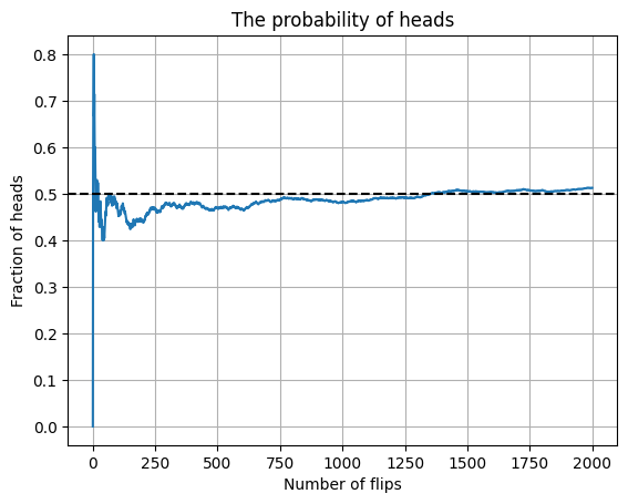 As more and more coins are flipped, the fraction of heads “settles down” near \(1/2\).
