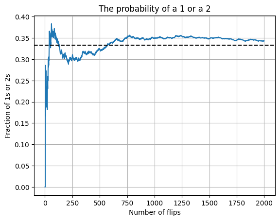 If the die was rolled over and over again, then a 1 will be the top face in about \(1/6\) of the times and 2 will be on the top face in about \(1/6\) of the times. This means that 1 or 2 will be on the two face happens in about \(1/6+1/6=1/3\) of the times.