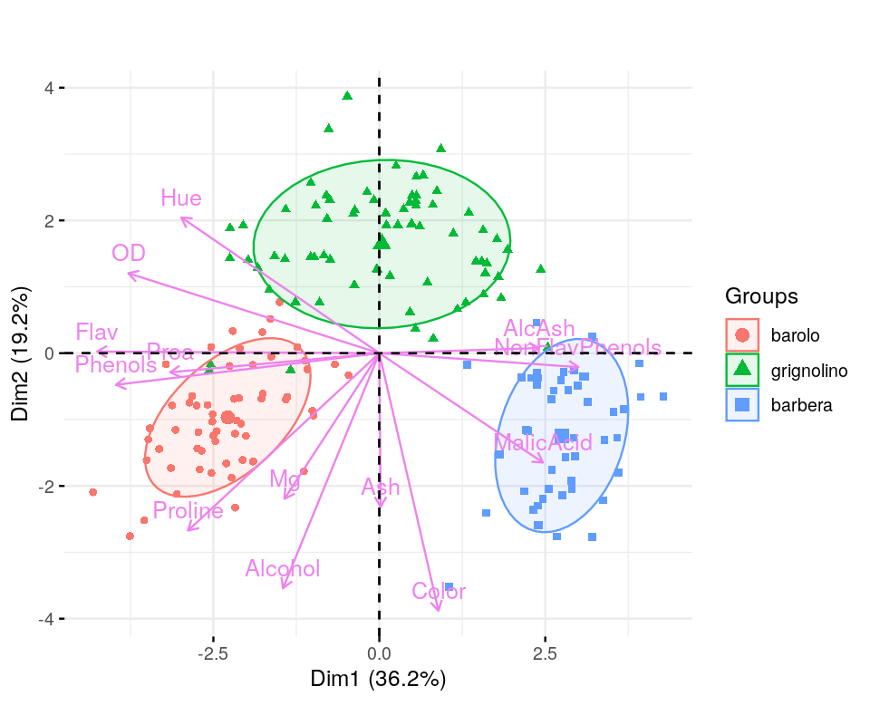 A biplot is a simultaneous representation of both the space of observations and the space of variables. In the case of a PCA biplot like Figure 7.32 the arrows represent the directions of the old variables as they project onto the plane defined by the first two new axes. Here the observations are just colored dots, the color has been chosen according to which type of wine is being plotted. We can interpret the variables’ directions with regards to the sample points, for instance the blue points are from the barbera group and show higher Malic Acid content than the other wines.