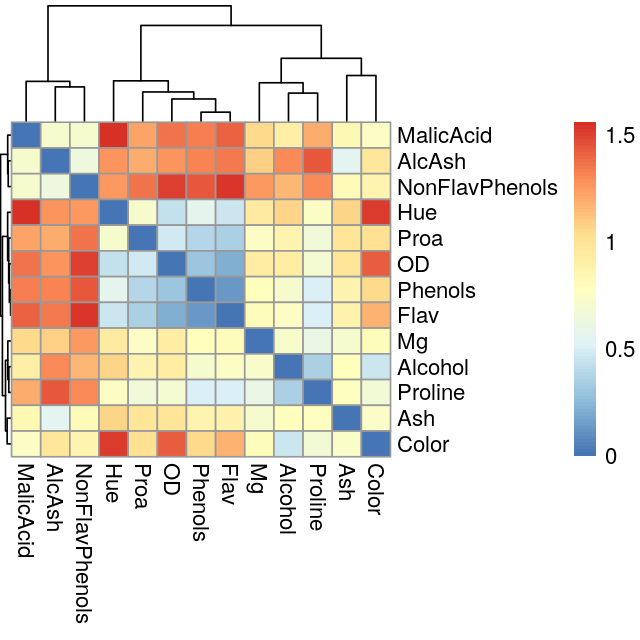 In the previous example, the number of variables measured was too large to enable useful concurrent plotting of both variables and samples. In this example we plot the PCA biplot of a simple data set where chemical measurements were made on different wines for which we also have a categorical wine.class variable. We start the analysis by looking at the two-dimensional correlations and a heatmap of the variables.