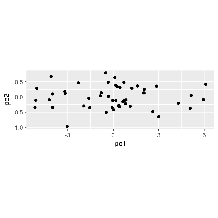 ggplot(dfpc, aes(x=pc1, y=pc2)) + geom_point() + coord_fixed(2)