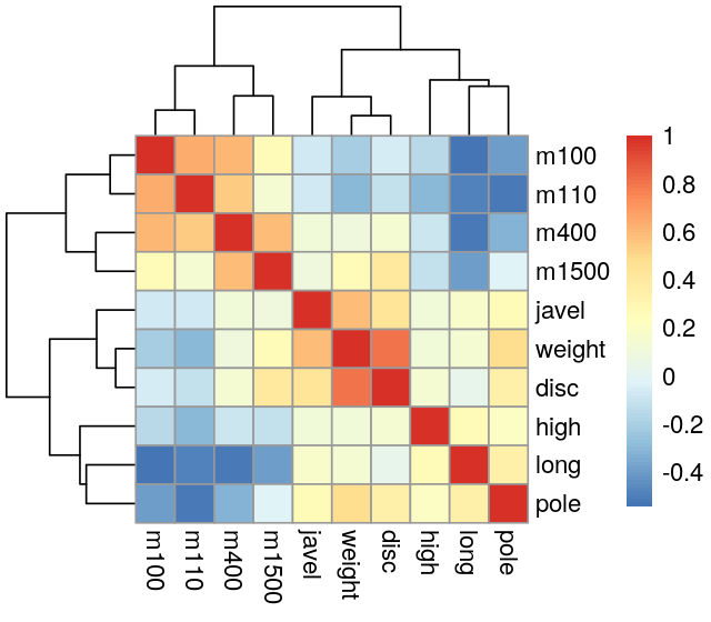 athletes data. Higher values are color coded red-orange. The hierarchical clustering shows a grouping of related disciplines.Figure 7.3 shows how the 10 variables cluster into groups: running, throwing and jumping.