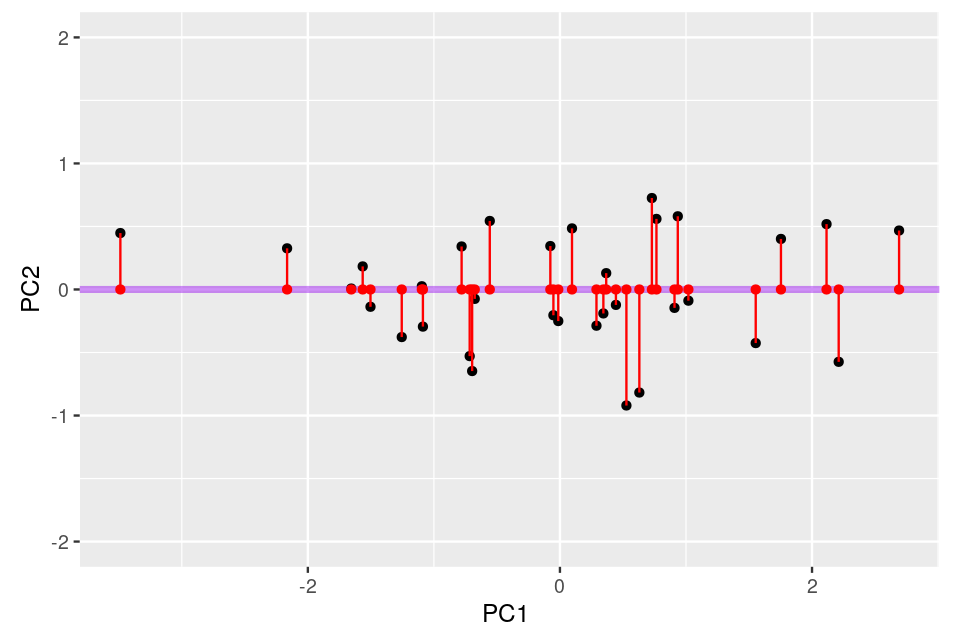 Biplot representations The space of observations is naturally a \(p\)-dimensional space (the \(p\) original variables provide the coordinates). The space of variables is \(n\)-dimensional. Both decompositions we have studied (singular values / eigenvalues and singular vectors / eigenvectors) provide new coordinates for both of these spaces, sometimes we call one the dual of the other. We can plot the projection of both the observations and the variables onto the same eigenvectors. This provides a biplot that can be useful for interpreting the PCA output.