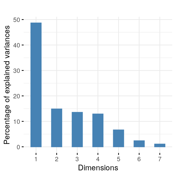 fviz_eig(pcamat1, geom = "bar", bar_width = 0.7) + ggtitle("")