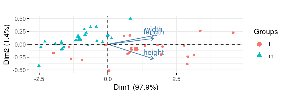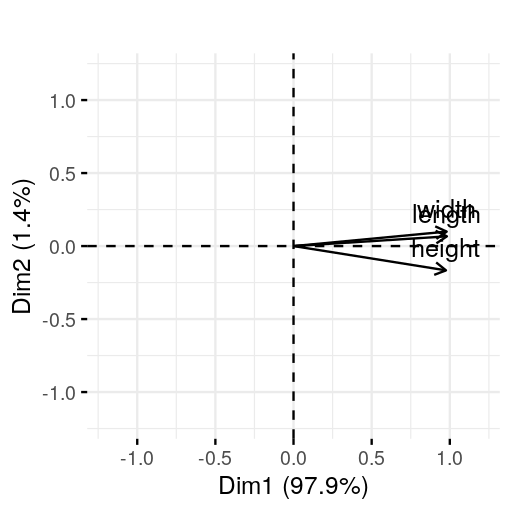 From Figure 7.2, it looks like all three of the variables are highly correlated and mostly reflect the same “underlying” variable, which we might interpreted as the size of the turtle.