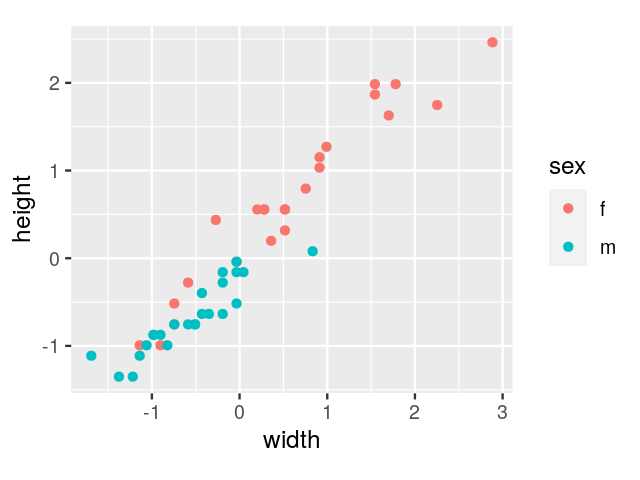 width and height variables: each point colored according to sex.We have already encountered other data transformation choices in Chapters 4 and 5, where we used the log and asinh functions. The aim of these transformations is (usually) variance stabilization, i.e., to make the variances of replicate measurements of one and the same variable in different parts of its dynamic range more similar. In contrast, the standardizing transformation described above aims to make the scale (as measured by mean and standard deviation) of different variables the same.