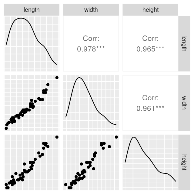 Question 7.2 Compute the matrix of all correlations between the measurements from the turtles data. What do you notice ?