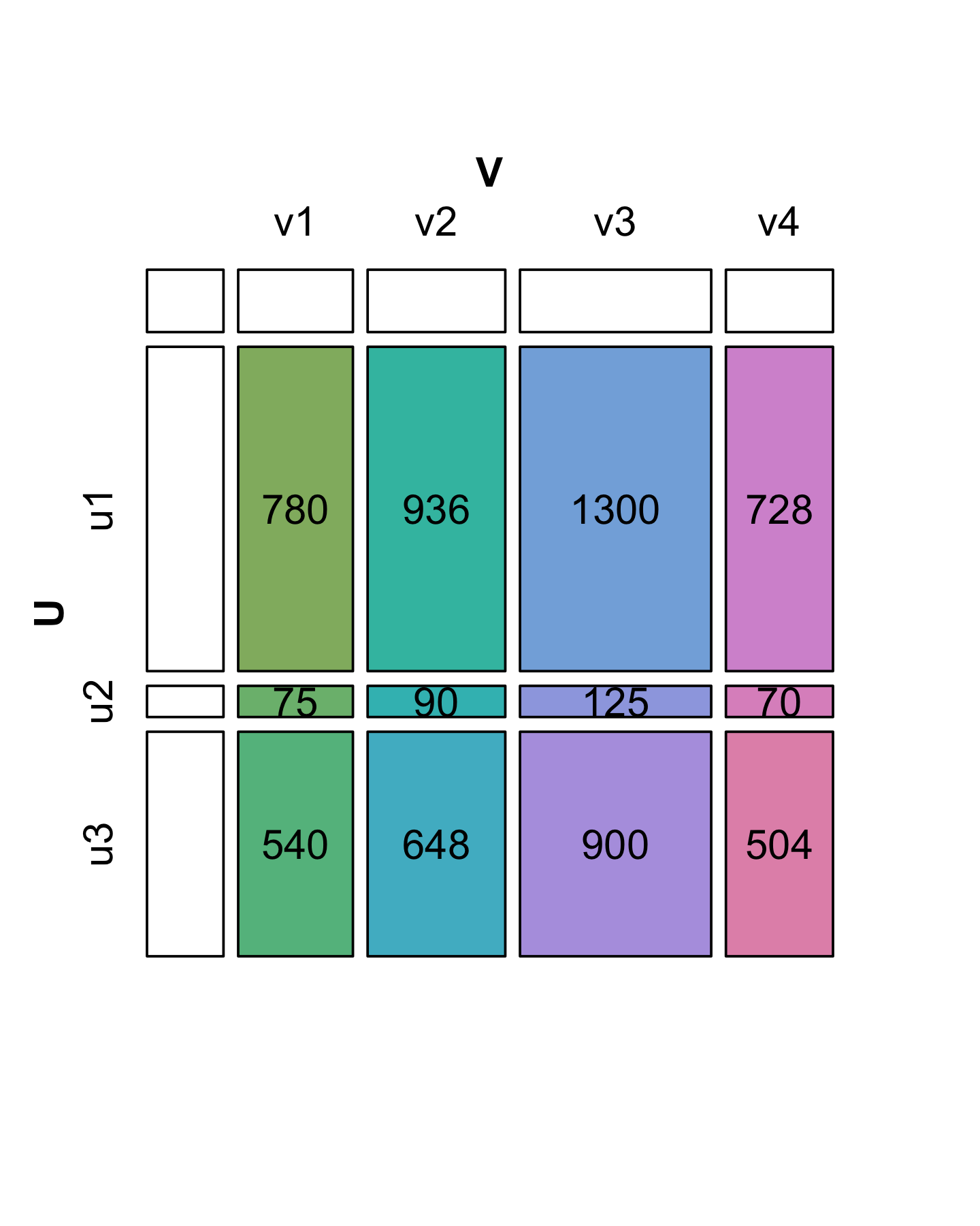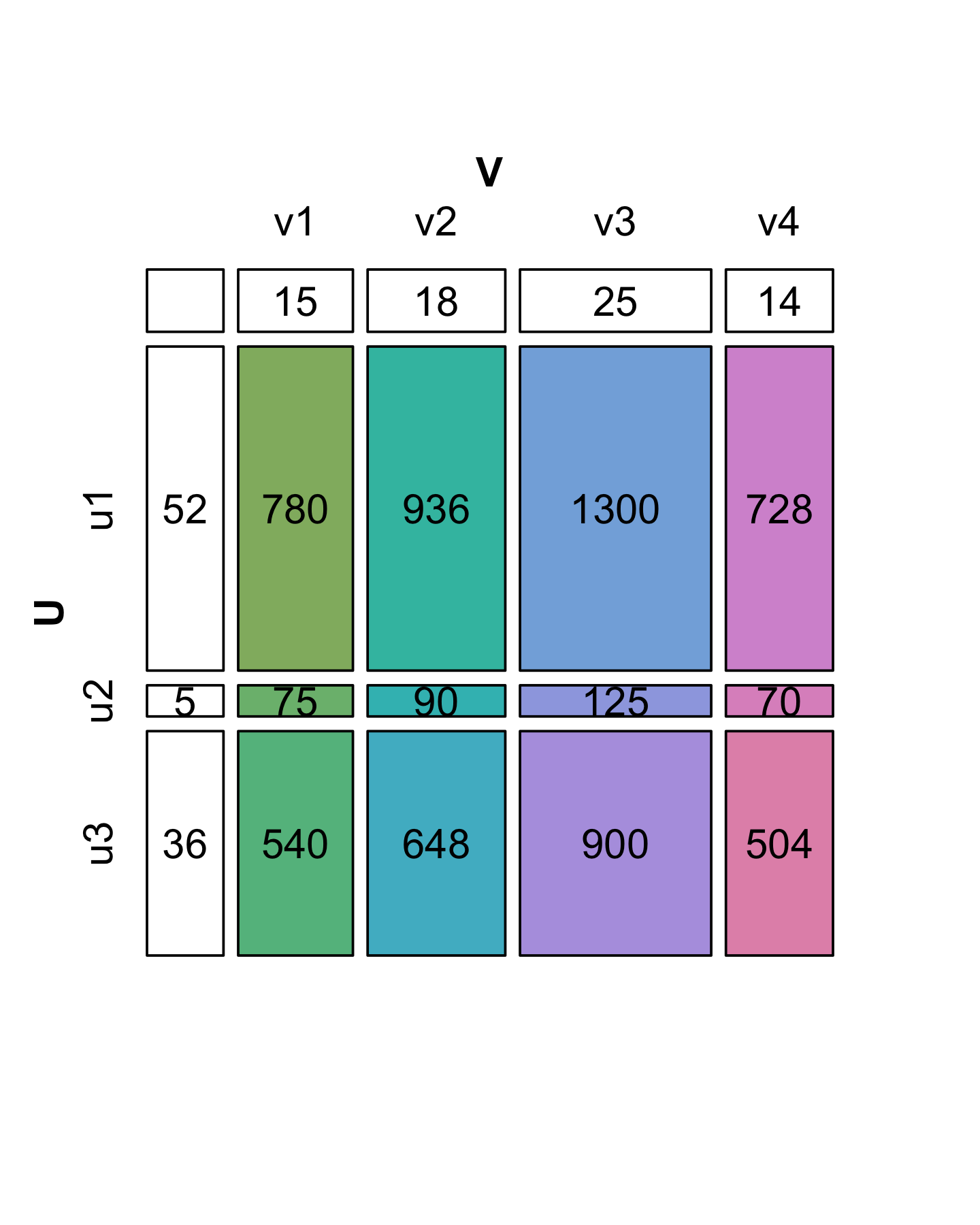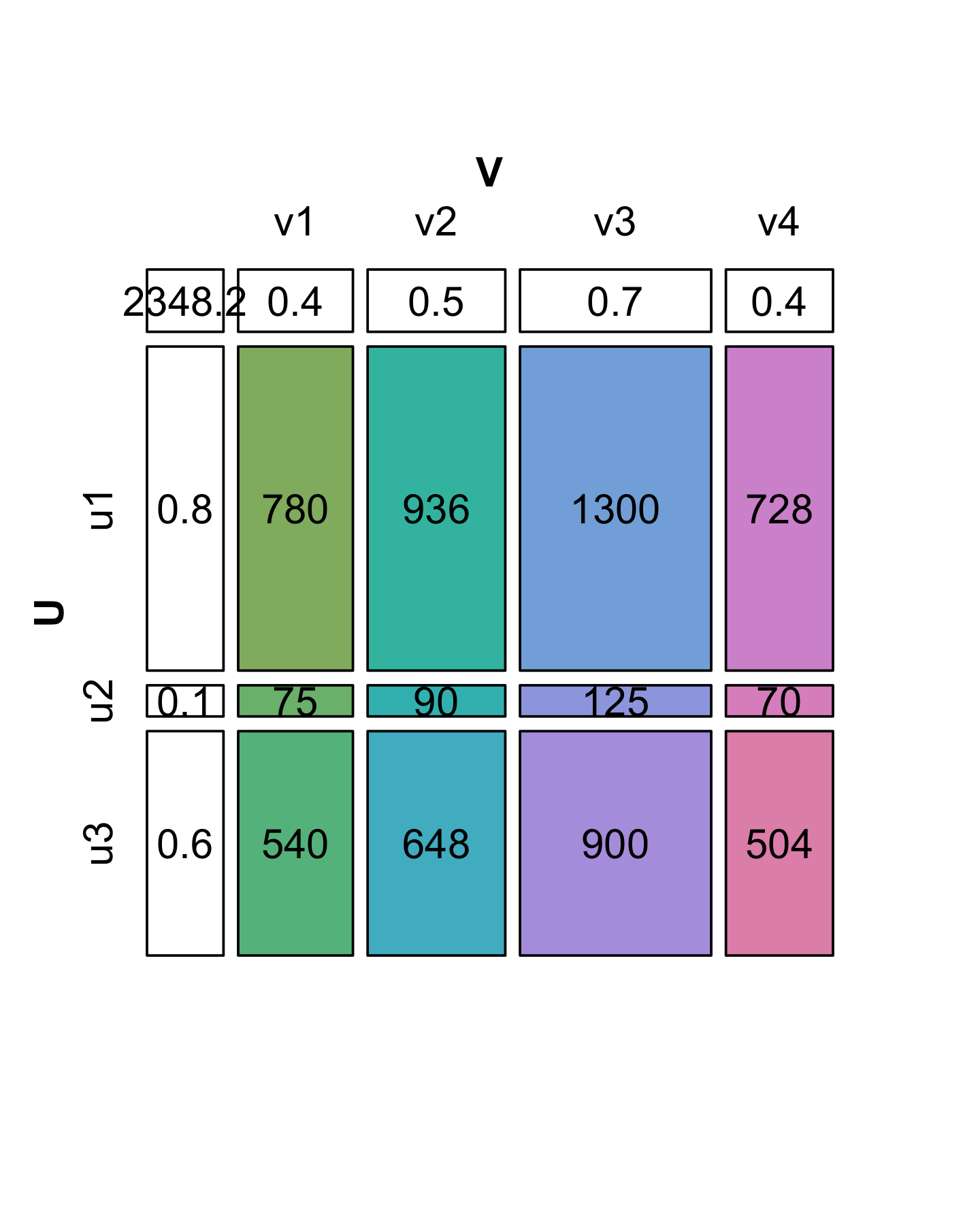 \[ **X** = \begin{pmatrix} x_{11} & x_{12} & ... & x_{1p}\\ x_{21} & x_{22} & ... & x_{2p}\\ \vdots & \vdots & \vdots & \vdots \\ x_{n1} & x_{n2} & ... & x_{np} \end{pmatrix} = \begin{pmatrix} u_{11} \\ u_{21} \\ \vdots \\ u_{n1} \\ \end{pmatrix} \times \begin{pmatrix} v_{11} & v_{21} & \cdots & v_{p1} \end{pmatrix} \]
