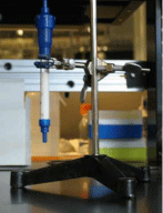 LEFT: DEAE chromatography column in its stand. RIGHT: DEAE column that has turned brown after use. Note the handwritten numbers on the side, indicating column volume.