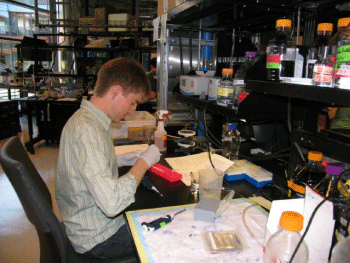 Tom is setting up an IEF gel at the protein gel preparation bench.