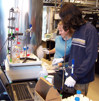 Laurie and Sam using the low pressure chromatography system to enrich tyrosinase in their mushroom sample.