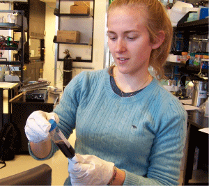 Laurie examining her clarified supernatant after grinding, homogenizing, and centrifuging her mushroom sample.