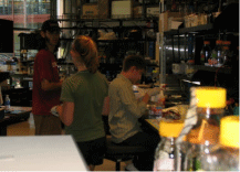 Sam, Laurie, and Tom working in the tyrosinase lab space.