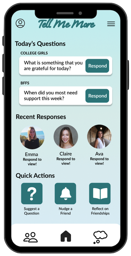 Staying connected with friends can be tough. It's often hard to have deep conversations or share personal struggles, which are key to understanding and support. Tell Me More is an outlet for friend groups to foster connection and vulnerability by responding to daily prompts designed to encourage meaningful conversation.