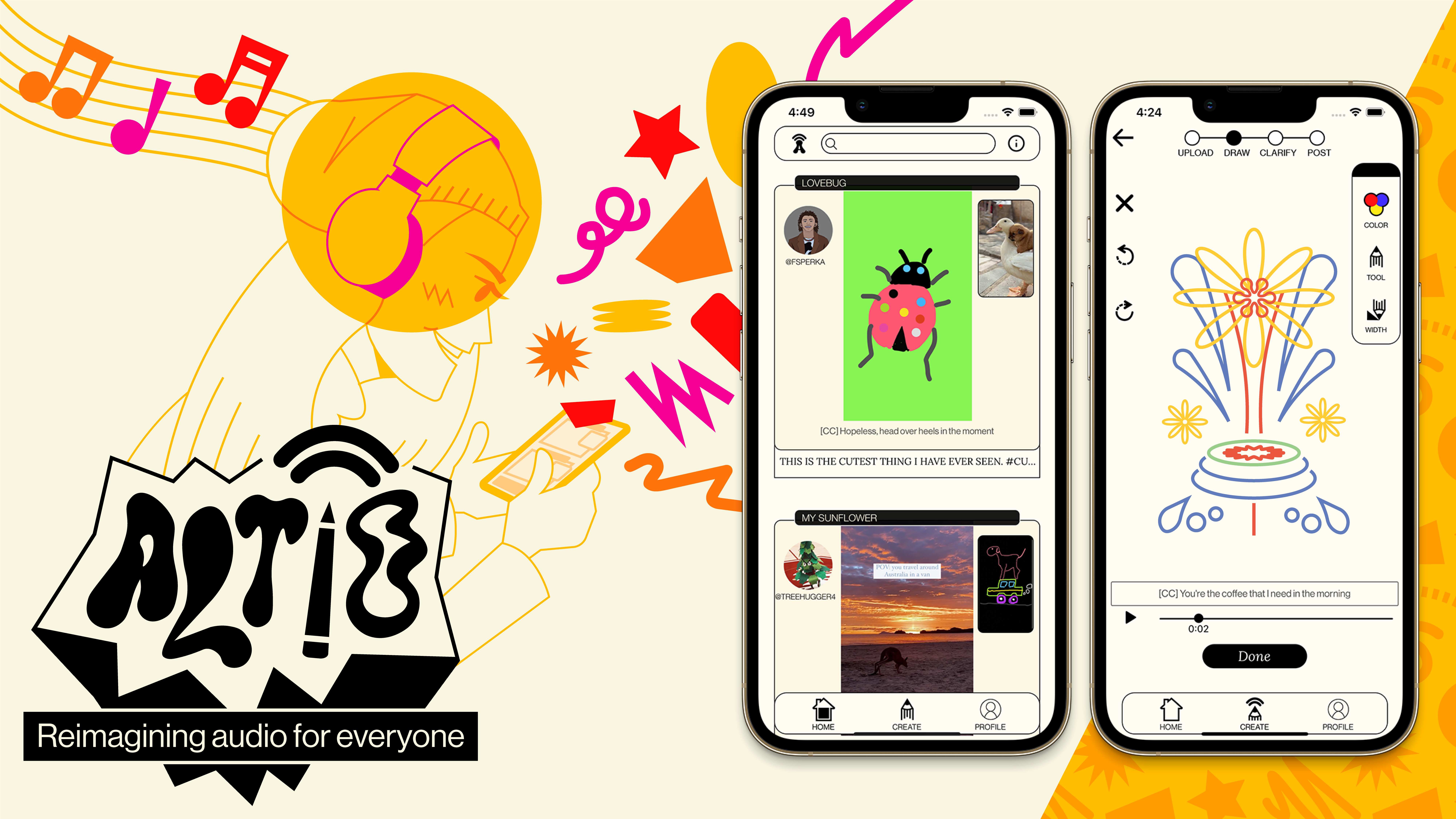 Using ALTiO, users can supplement audio posts with drawings and artwork that convey these specific feelings in a visual way. The stakes for creating an “ALTiO” are only personal–users don't have to be artists to show how they feel, they just need the tools to do so! Users can then explore these various creations by artist or genre to discover and engage with different visual content.