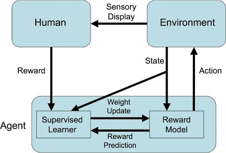 W. Bradley Knox, and Peter Stone. "Tamer: Training an agent manually via evaluative reinforcement." In 2008 7th IEEE international conference on development and learning, pp. 292-297. IEEE, 2008. |
