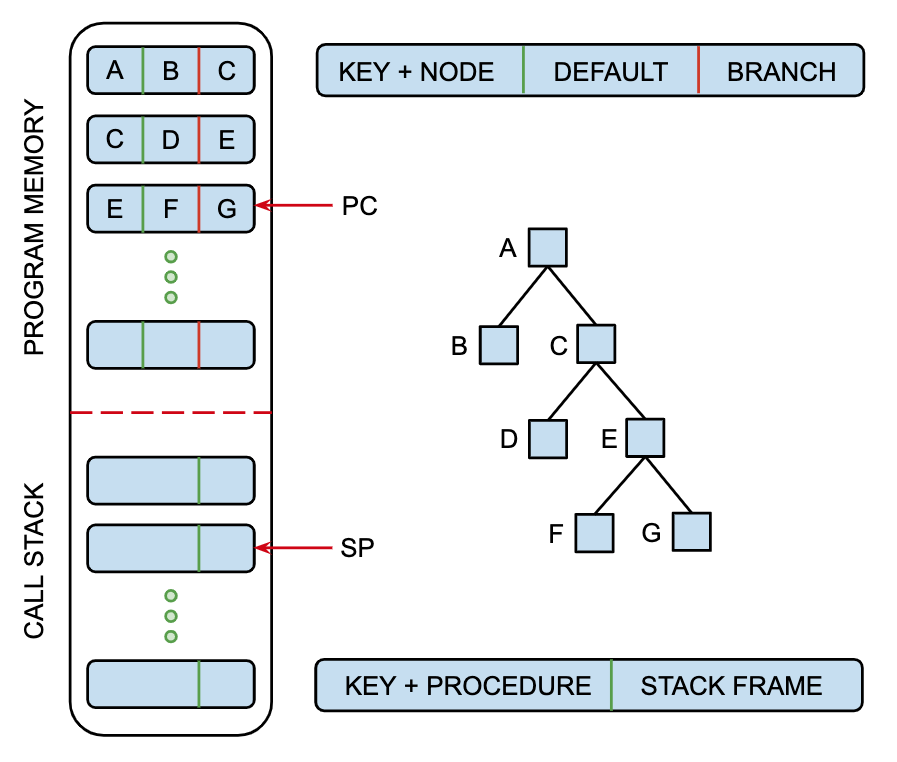 Referring to the abstractions and abbreviations introduced in the previous section, reading a program from STDIO — the analog of a human programmer reading a program displayed on a monitor — will result in — at least — two different internal representations of the resulting AST: an embedding vector in the SMS and a key-value representation in the DNC. The former allows us manipulate programs and program fragments as fully-differentiable representations within distributed models. The latter allows us to modify, execute and share code in a human-accessible format, fully compatible with our software-development toolchain.