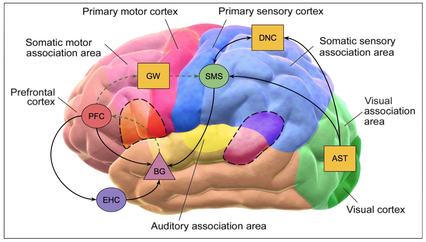 | Figure 1: This figure highlights the primary architectural components mentioned in the main text superimposed over an anatomical rendering of the human brain identifying related cortical and sub-cortical landmarks. The triangle and three ovals and match the shape and color conventions employed in O'Reilly [72] where you will find a substantially more detailed explanation of the underlying biological model. The three gold square shapes denote abstract architectural structures and not anatomical features. The acronyms are expanded and explained here. | |