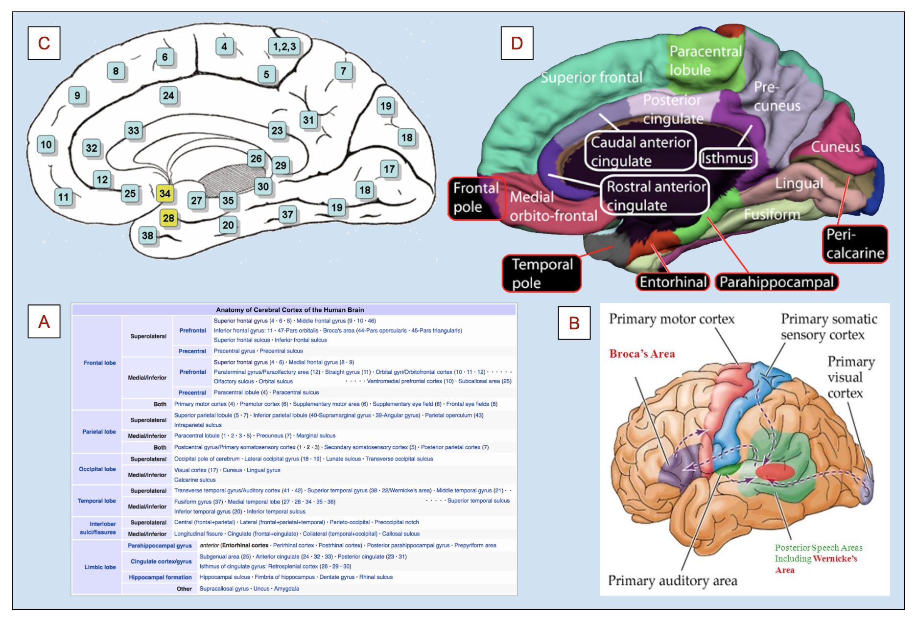 | Figure 38: Panel A lists the regions of the human cerebral cortex including the relevant Brodman areas [REF]. Panel B illustrates some of the pathways involving language including Broca's area considered responsible for production [REF] and Wernicke's area [REF] implicated in comprehension. Panel C displays a sample of Brodman's areas as landmarks, highlighting areas 28 and 34 in the temporal lobe associated with the enterorhinal cortex [REF]. Panel D identifies a number of cortical and subcortical areas associated with the entorhinal cortex and episodic memory in particular [REF]. | |