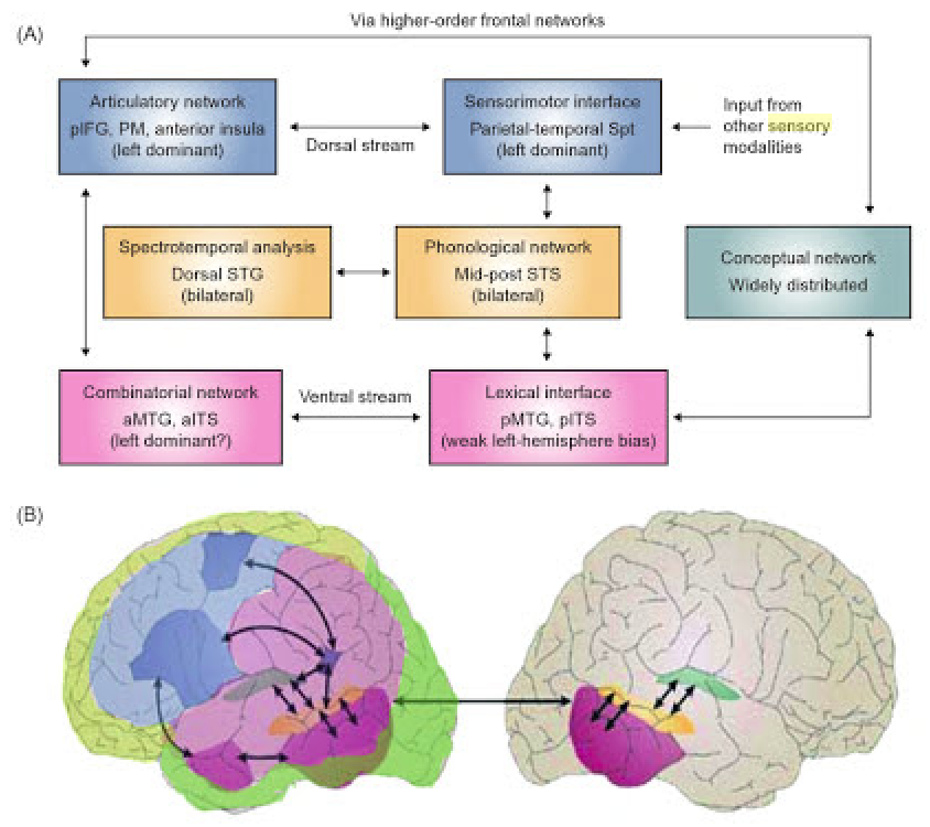 "I argue that language comprehension in sighted people might best be thought of as a kind of code-directed scene comprehension that draws heavily upon specifically visual, and probably largely prelinguistic processing constraints. The key processes of word-recognition and the assembly of visual word meaning patterns into interacting chains, however, may be mediated in part by species-specific activity patterns in secondary auditory cortex similar to those generated by uninterpreted speech-sound sequences." — (SOURCE: [117] in [269])"This tendency to ignore the structure of the brain is quite unfortunate in light of the recent progress made in primate neurobiology. Most current texts of physiological psychology, neuropsychology, and cognitive neuroscience (e.g., Caplan, 1987; Ellis and Young, 1988) still implicitly employ a model of the organization and evolution of the cortex that dates to the associationists of the late nineteenth century. In this way of thinking, ’primitive’ mammals like rats start out with primary visual, auditory, and somatosensory areas almost touching.