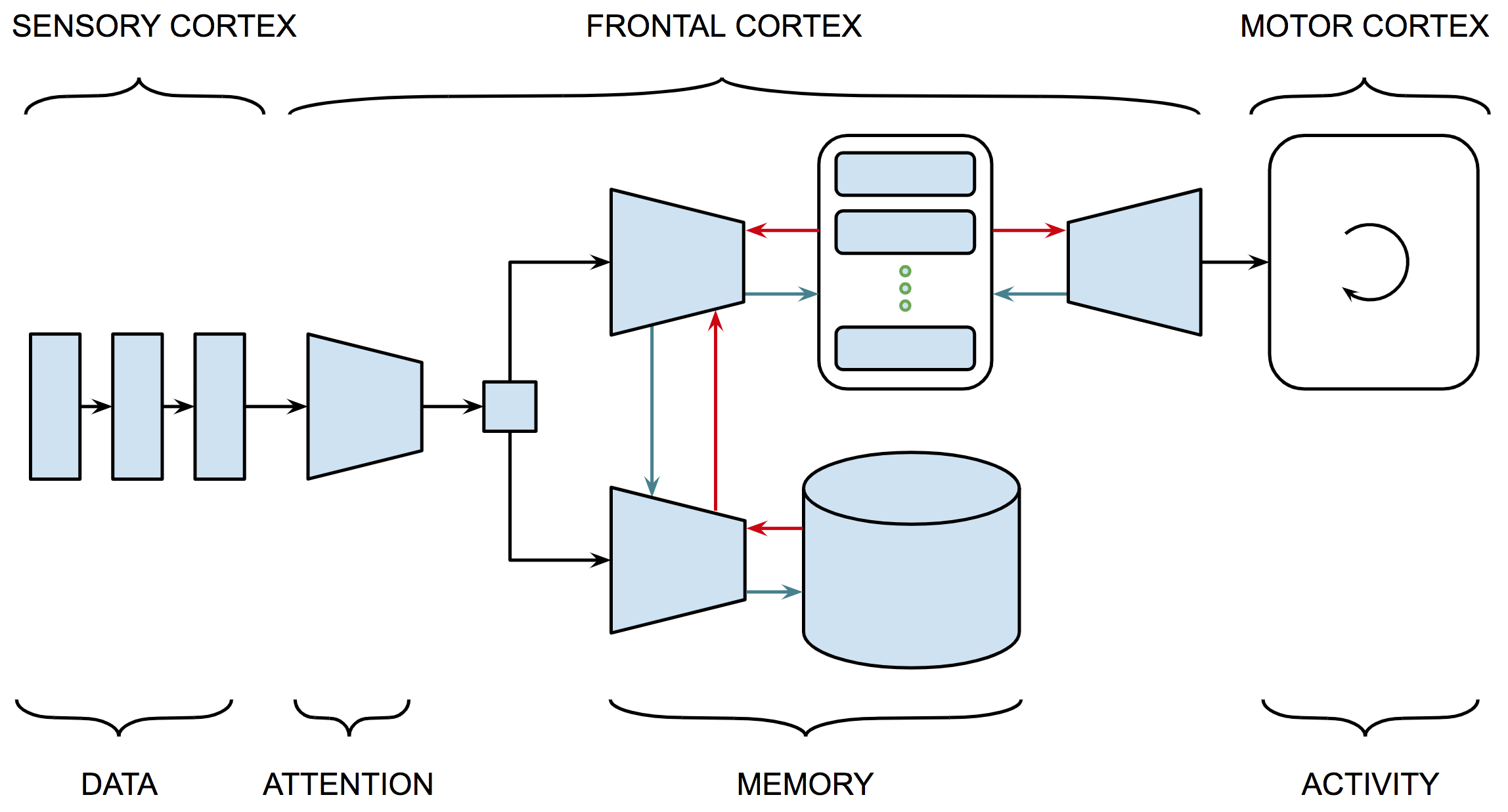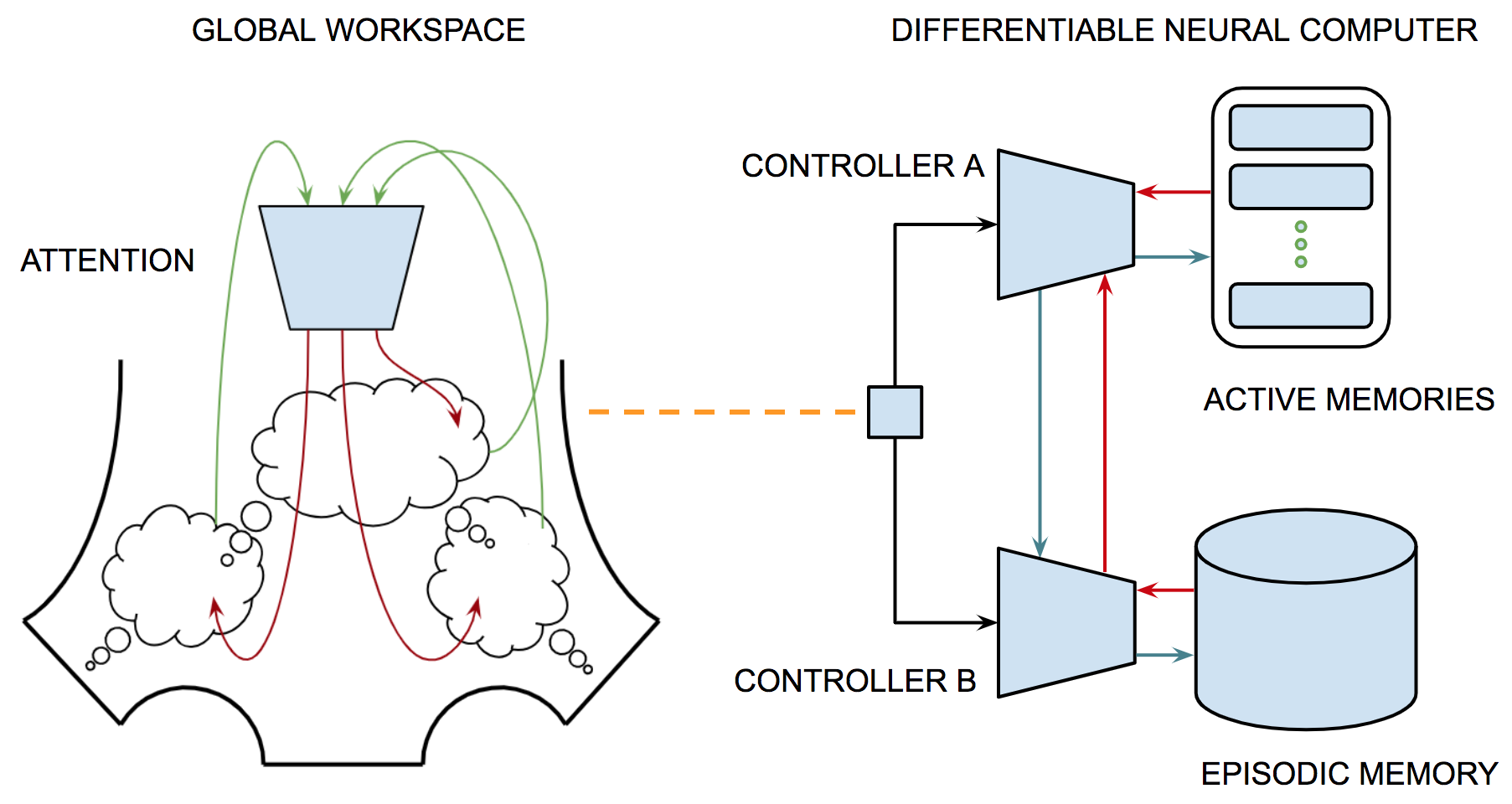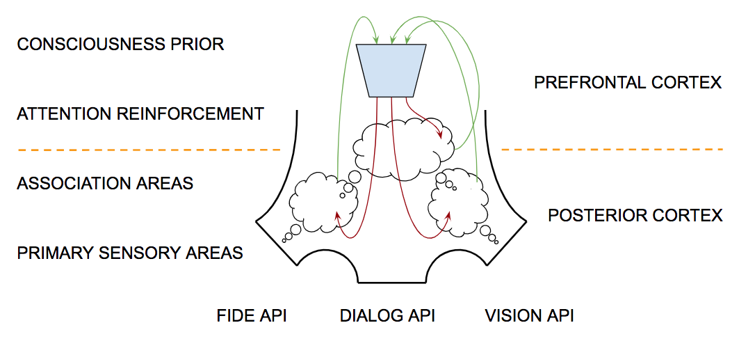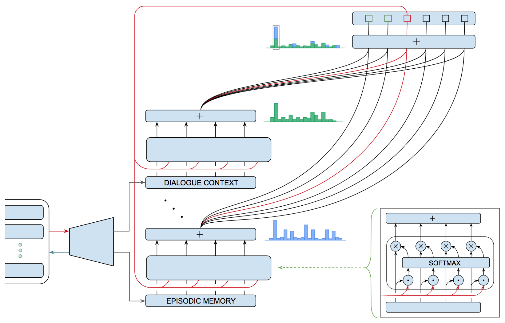 Figure 5.A shows a schematic description of an attentional selection module that learns what part of our recent experience is most important for our current purposes and makes that information available to guide inference. The network shows four (feedforward) connections to the bottom layer each of which corresponds to a thought vector of the same size. The red (recurrent) connection corresponds to a single thought vector summarizing the current state of information, i.e., the context for current decision making. Each of the feedforward vectors is concatenated with the current context vector and fed into a softmax layer, the output of which is used to decide (gate) which of the four (feedforward) thought vectors is most relevant to the current context.