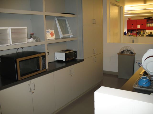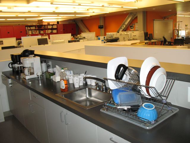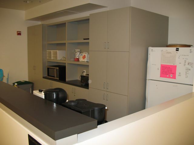 Here are three pictures of an unsuccessful cafe. Dan, if you read this, perhaps you can comment with your own impressions, having known the space better and longer than any of us. To me (MB), there never seems to be any activity in this space. Sure, individuals might use it to keept their lunch in the fridge. Or to reheat something. But I have never seen any social activity around that space.