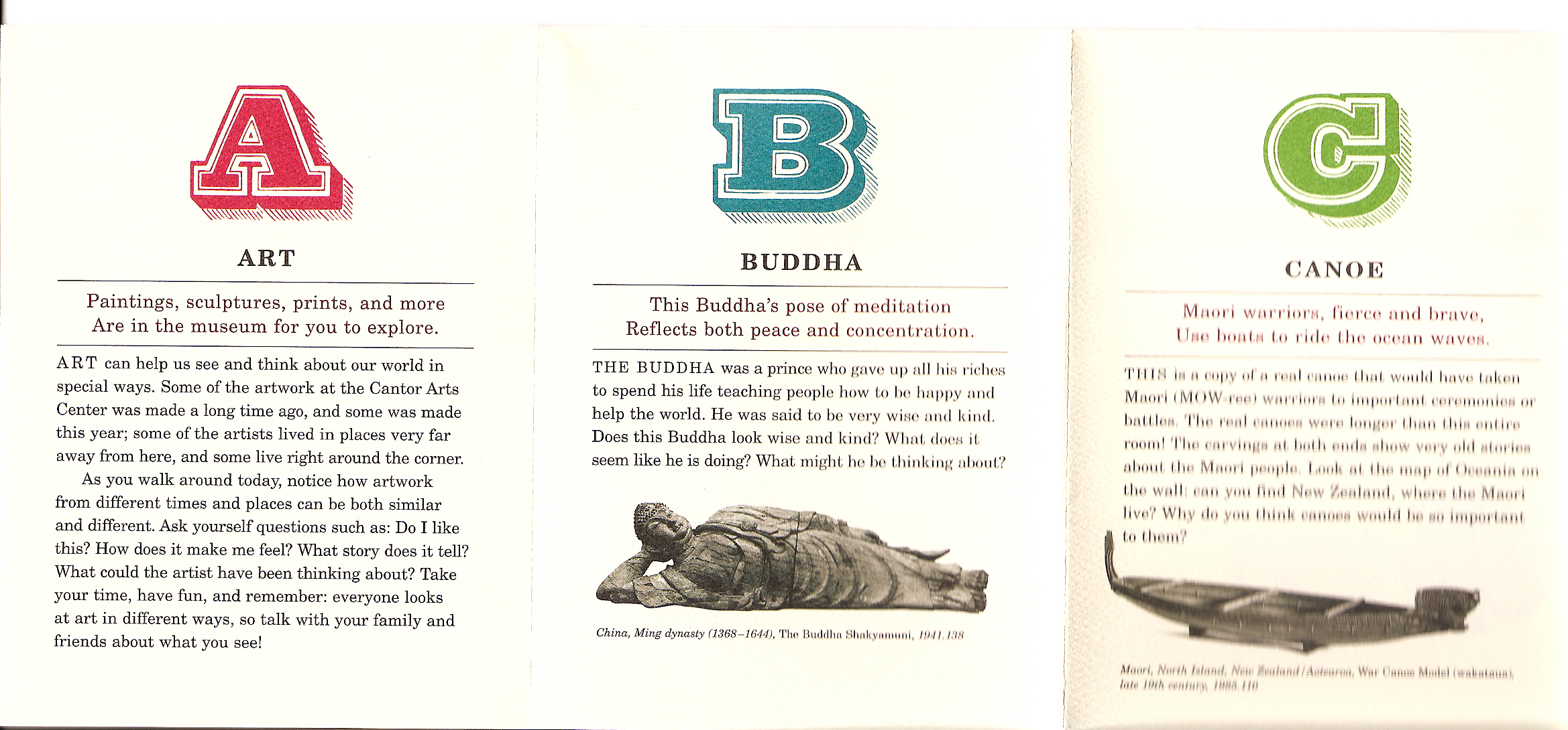 What I liked: • The layout, lighting, how there was plenty of space to walk around and it wasn’t too crowded. • Signs explaining the pieces, and the parts of the world they came from • ‘ABC’ pamphlet that started out with A for Art—What is Art? This is a question I often ask myself in museums, and I liked their answer: “Art can help us see and think about our world in special ways.” I also liked the questions it suggested people ask themselves (Do I like this? How does it make me feel? What story does it tell? What could the artist have been thinking about?) I also really like how the booklet reminds people to talk to family and friends about what they see, and to have fun!