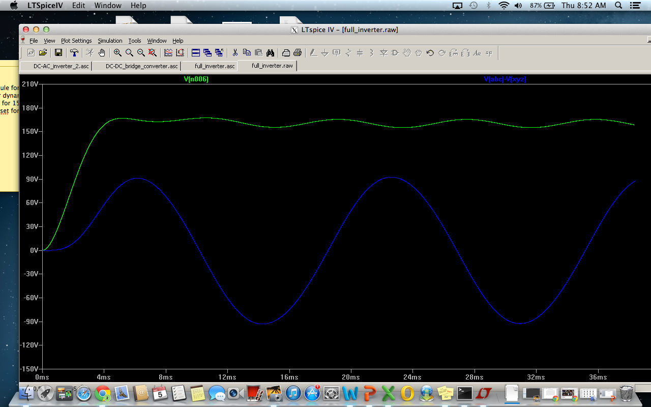 The above is a simple block diagram of my two stage inverter. At the end of the DC-DC full bridge converter, I wanted a DC voltage of 170 V, which is equivalent to 120 Vrms, and then I would use this to generate AC voltage at the load. So, first of all, I worked on the individual stage, and designed them accordingly in LTSpice, and at the end combined both of the two stages together at the end. Below are some simulation results that I got from individual stages and the whole inverter.