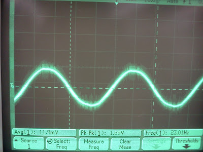 I was also able to make a very crude working prototype of the DC-AC inverter stage using AVR micro-controller. For this, the issue was to figure out how to generate 60 Hz, by using a PWM. So, for each alternate diagonal pair of MOSFETS, I needed to generate a PWM, and the different points of the sine wave would correspond to different duty cycles of the PWM. I found a sine wave table on the internet, which I used in my code, to assign its values to different PWM levels. One issue with that, because I had 256 samples in the sine wave table, and the frequency of the PWM being generated was very limited by the prescaling factors of the pins, I was able to generate a 22 Hz sine wave, not 60 Hz. One way to get around it, was to store larger number of samples, since f(sinewave) = f(of PWM) / no. of samples. I calculated to use 766 samples in the sine wave but didn't have enough time to complete it. However, by using a 2V of DC supply, I was able to generate a 1.7 Vpp of AC(because I clamped or changed my duty cycle so as not to go all the way upto 0 or 256). I used the half bridge modules that we had in the lab, and 10mH(but with very small current capacity) and 4.7uF capacitor to filter it. So, at the end, across a 10 ohms of 1/4 watts resistor load, I was able to get a AC sine wave, that looked like the following: