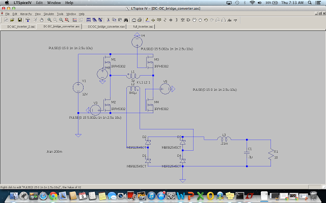I worked on a stand-alone DC-AC full bridge topology inverter for my final project. There were few topologies to chose from, but since I was working with high power, I planned to use a two stage DC-AC full bridge inverter consisting of a DC-DC converter stage, and then a DC-AC inverter stage. The inverter would take in a 12 V input, and would give 120 Vrms, with 15 A of Irms, at 60 Hz of frequency, with 1.8 kW of power. Basically I wanted to be able to drive any AC load using this inverter. First of all, I wanted to make a running simulation of the full-bridge inverter, and then work on designing an inverter that had an efficiency of 90 %.