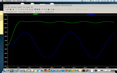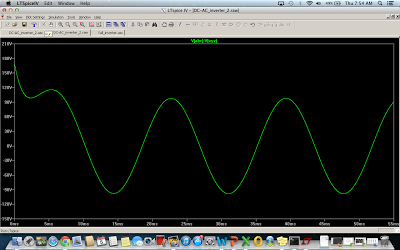 At the end of the simulation, I expected a Vp of 170 V, however, my spice designed suffered in efficiency from choosing very large inductor values for transformers. This was one of the things that I learned, since in spice simulation, I had thought only the turns ratio mattered, however, inductor sizes affected the efficiency. Also, my DC-AC inverter, might not have been running in full duty cycle, which probably has to do with the PWM, I was generating with the triangle and sine wave while driving the MOSFETS. These two things are what I plan to work more in the future.