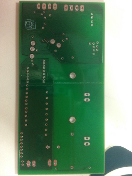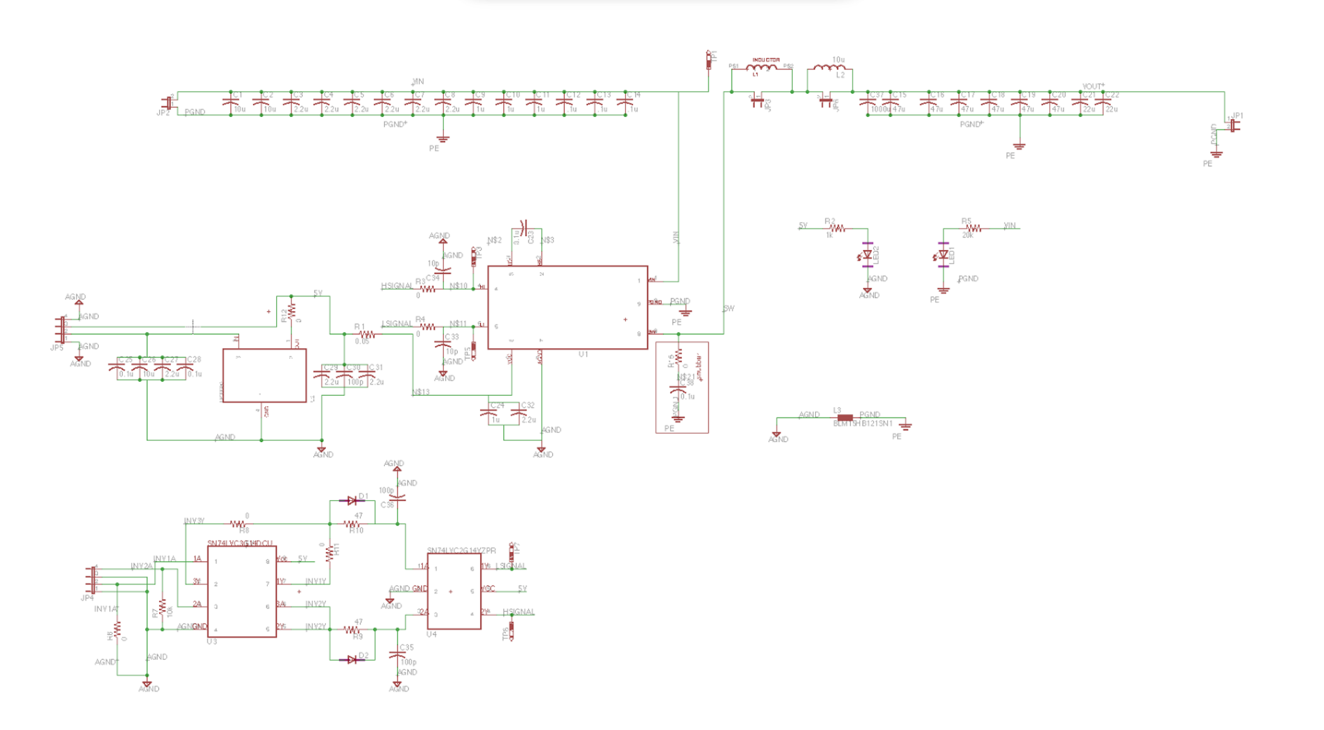 Our final schematic(2) is shown above. It is based on the suggested design by Texas Instruments. It includes a 5V regulator, a large array of input ceramic filter capacitors, output filter, separate power and analog grounds, a snubber for removing excess energy from the switching node in case of inductive parasitics, and the deadtime control circuit. To isolate switching noise from the digital control side, the power and analog grounds are separated by a ferrite bead.