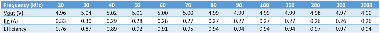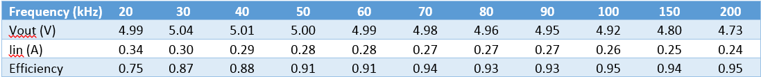 The circuit performed as expected. We input a voltage of 10 V, gave the half-bridge a 50% duty cycle, and the output voltage stayed at approximately 5 V. Below are the measured efficiencies and pictures from the circuit in operation. The efficiencies are slightly inaccurate because we couldn't get a good current reading at the input, but they are close.