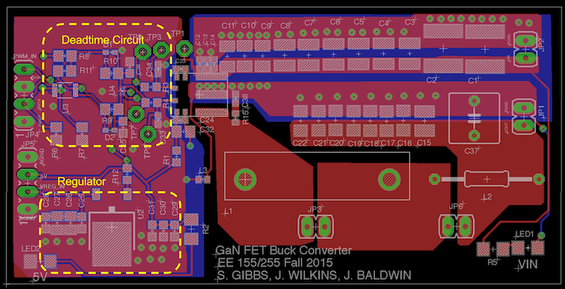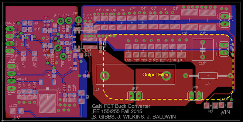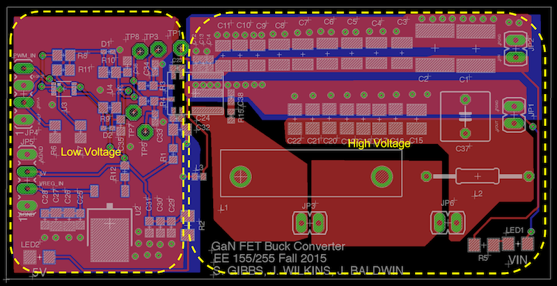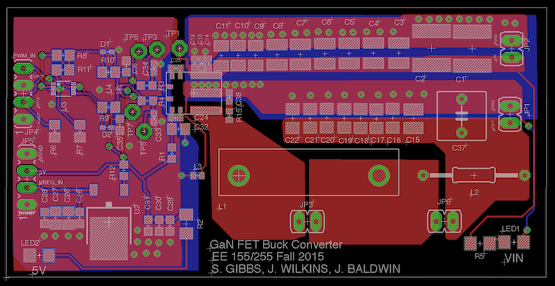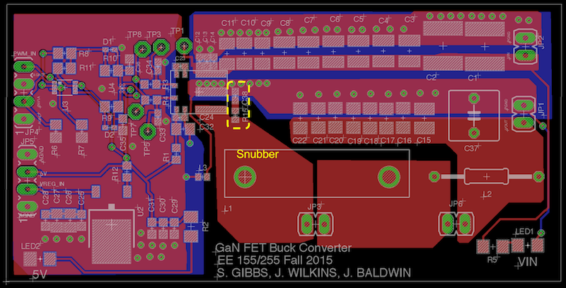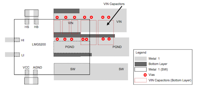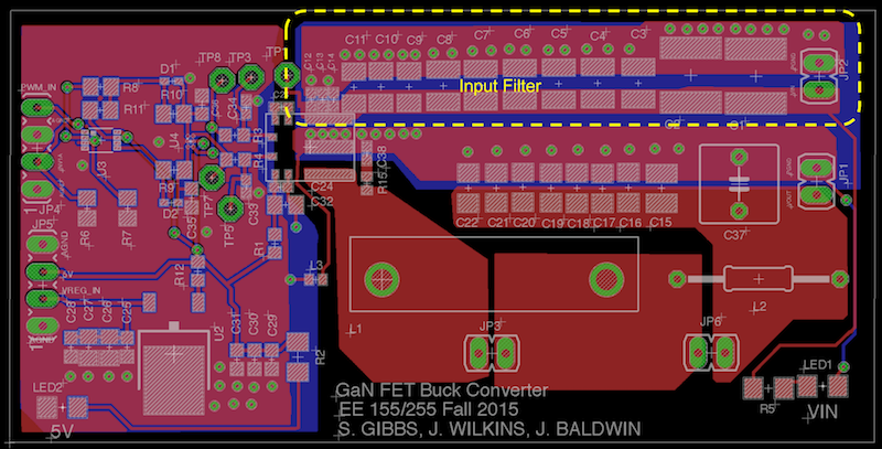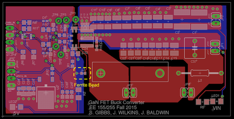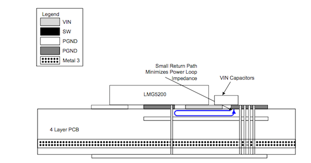 Perhaps the most important aspect of this project was a careful layout of the PCB. As shown above, the LMG5200 pads are laid out such that the input power rail and power ground are located right next to each other. The parasitc inductances we are conserned about lie in the loop between the supply capacitors, and the drain of the high transistor and source of the low transistor. By placing the smallest (high frequency filtering) capacitors immediately next to the VIN pad, the current loop is limited to the small region shown by the blue arrow. Placing the power ground return plane in layer 2 also reduces return path length. Additionally, the anti-parallel flow of the current reduces EMI emission by creating a net zero current along that axis.