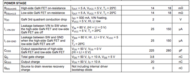 Below are the power stage specs for the LMG5200. Note the 3.8 nC gate charge and 0 nC reverse recovery charge... these are the main reasons to use GaNs.