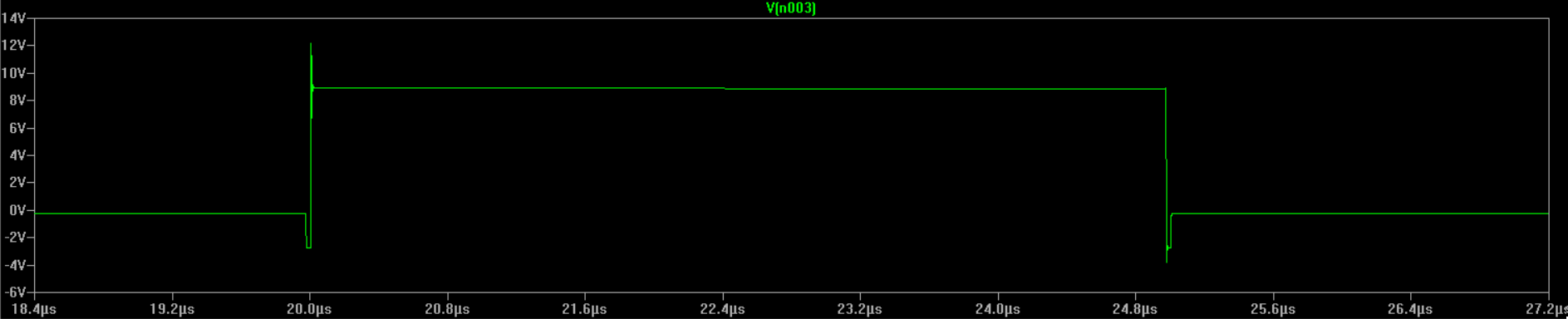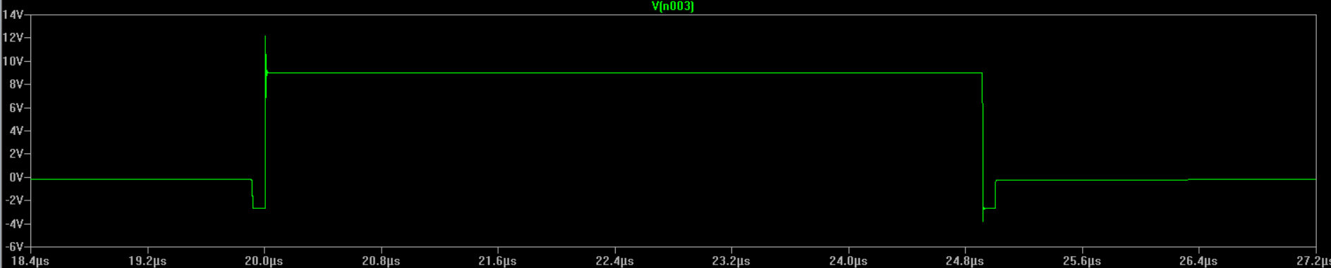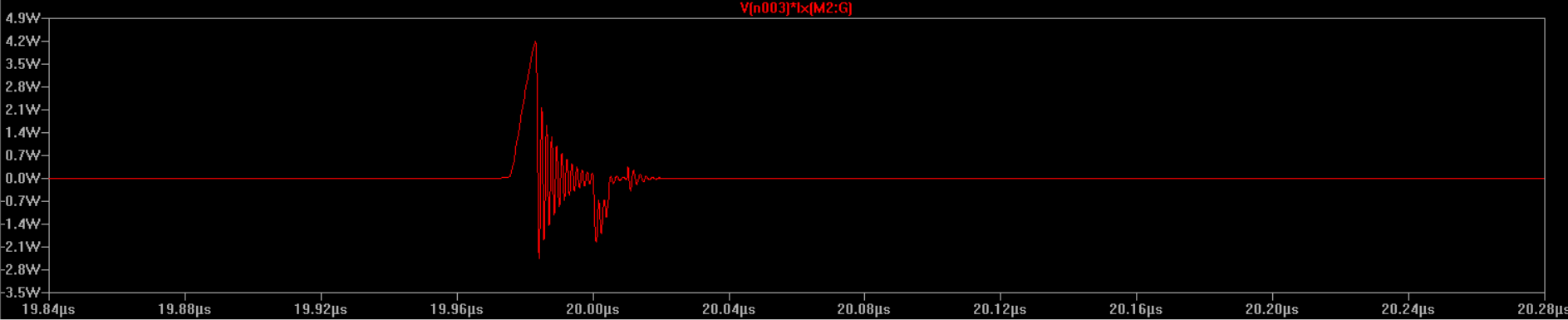 To get an idea how the circuit should perform, we simulated the circuit in Spice. We measured the efficiency of the simulation at different frequencies, but using a low dead time, because this should be most efficient. At 100 kHz, the input power was 2.41 W and the output power was 2.34 W, making the efficiency 97.1%. At 200 kHz, the input power was 2.43 W and the output power was 2.35 W, making the efficiency 96.7%. The pictures below show some traces from simulation.