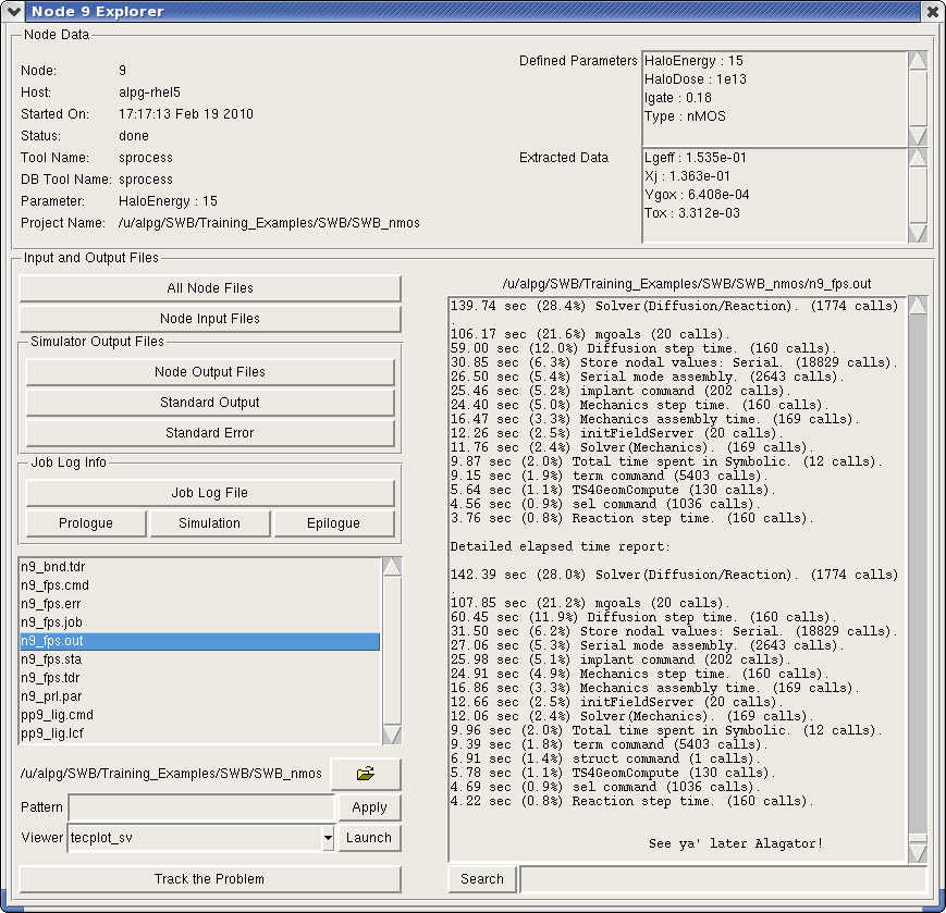 The simulator is launched using the batch tool gjob, which produces two output files per simulation node: n@node@_<tool_acronym>.job and n@node@_sge.err. Information about the preprocessing of a project can be found in the file preprocessor.log. The simulator output files are named n@node@_<tool_acronym>.<extension> and pp@node@_<tool_acronym>.<extension>. For example, all files n3_fps.<extension> belong to Sentaurus Workbench node number 3 that performs a process simulation with Sentaurus Process.