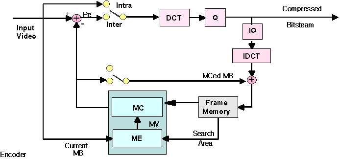 When the encoder operates in INTRA mode, the original input image goes thorough DCT (Discrete Cosine Transform) and Q (Quantization) and variable length coded (VLC). In the Figure 1. VLC and VLD (Variable Length Decoding) are excluded. And the decoder decodes the bitstream with the INTRA mode, which means the compressed bitstream becomes the original image if it goes through VLD, IQ (Inverse Quantizer), and IDCT. But if the encoder operates in INTER mode, the every MB in the original input image is compared to the previously reconstructed frame which was stored in Frame Memory and the Motion Estimation (ME) is performed to find the motion vector (MV) which could be used for best motion compensation (MC). And the prediction error (Pe), the difference between the original MB and the motion-compensated MB, is encoded to compensate for the disparity between the original MB and the motion-compensated MB. Then, the MV and the encoded Pe are sent to the decoder to make the next INTER frame. The decoder uses the MV and the encoded Pe to reconstruct the original image in the INTER mode. Detailed operation of the hybrid codec is explained well in [5].