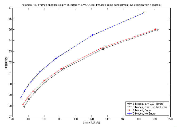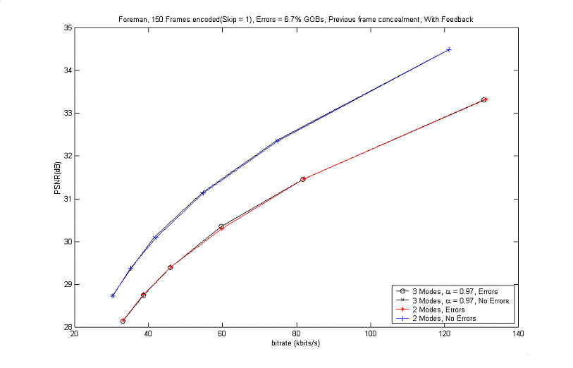 The pattern of the errors used in the experiment was assumed to be 3 consecutive GOBs (Group Of Blocks) losses, and the position of 3-GOB losses were assumed to be random in a frame. Further, the percentage of GOB losses for the entire frames was set to 6.67 %, and it was achieved in the following way. First the random frame numbers which would have 3-GOB losses were generated keeping the loss percentage for the entire frames. Then, the position of the 3 GOBs was determined. But the position of errors was the same in each experiment in order to compare the results in different environments. And it is assumed that the encoder has exact knowledge of the mismatch between decoder reconstruction and encoder reconstruction for the feedback cases in order to influence the mode decision among the INTRA, INTER, and L-INTER modes. For all experiments, the previous frame concealment was used to conceal the errors when the GOB losses happen and the 'foreman' sequence was used as a test sequence. The experiments were done for four cases. Two of them are aiming at finding the pure effect of the L-INTER mode and the others are aiming at finding the influence of the new coding mode in the rate-distortion based optimal selection when there is feedback information.