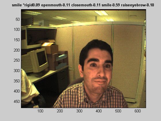 There have been many previous work on facial expression recognition. In [10], Chen et. al. uses learning subspace method on features obtained from images of subparts of the face. In [11],Wang et.al. uses 19 point 2D feature tracker for the recognition of three emotional expressions. In [12], Lien et. al. used feature tracking with partial affine transformation compensation in order to recognize the movement directions of action units. In [13], Sako and Smith used color matching and template matching to find the positions of important features on the face and used the dimension and position information about these features for expression recognition. In this work, the features were detected regardless of the 3-D pose of the subject, however the recognition rates were below the other mentioned 2D methods. In [14], Hara and Kobayashi used scanline brightness distribution to detect six different expressions and implemented a robot that responds to the behaviors of the subjects. Chang and Chen used neural networks to distinguish between three facial expressions[15].
