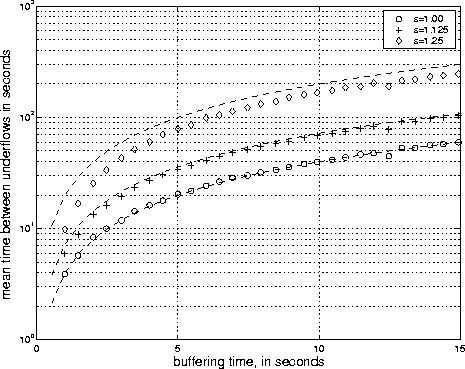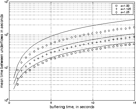 Finally, we should note that a much simpler analysis produces accurate results, especially for the non adaptive case. By comparing the average rate of packet arrival do the rate at which packets depart, one can arrive at the following expression for the mean duration between buffer underflows: