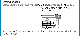 3. ERASE SINGLE IMAGE: Any image that you are viewing in Play Mode can be erased by clicking on the fourth furthest to the right button below the viewfinder screen, with a blue icon of a trashcan beside it. Just click on this button and then click on the set button (furthest to the left) when asked whether you really want to erase it. With two thumbs you can swiftly scroll through your photos and erase those you don't want to keep on the Compact Flash Card. You can't UNERASE so check to make sure that you really want to erase it before you do.