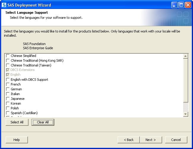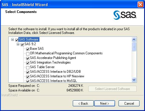 Choose what parts of SAS to install. We suggest that you push Clear All then check to install:
