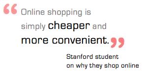 Experience with Internet Increased experience with the Internet and high numbers of hours online are also factors that positively affect online shopping behaviors. All students need to have a certain level of computer aptitude because their grades depend on it. Students need to be able to navigate sites such as CourseWork, upload assignments, and do online research for papers and projects. Residential Computing found that 66% of students spend 6 hours or more per week doing computer-mediated academic work. Consequently, it can be said that the majority, if not all, of Stanford students are experienced Internet users. The more a person goes online, and gains experience, the more likely he or she is to lose the fear of online purchasing. How it all adds up Because students use the Internet for financial services they are more willing to shop online. They can change financial aid distribution, pay tuition, buy parking permits and modify meals plans. Since they learn to move money electronically, the fear of spending it electronically also diminishes. The general population avoids making online purchases because of reluctance to give out credit card info, excessive shipping charges, and unwillingness to give out personal information (Lida and Copas, 2002). Yet, students are continuously asked to pay for services online. Financial aid services such as the CSS Profile require online submittal as well as online payment. Previous generations did not have the choice of making payments online but our generation was introduced to it at a young age. Since students have more experience dealing with money on the web they are more likely to trust online stores with our credit card and personal information. Through these examples one theme flows through them all: the Internet helps save money. So does it all come down to price? |