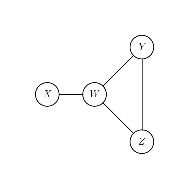 Each of \(X,Y,Z,W\) has a corresponding logistic regression model formed by conditioning on its neighbours.