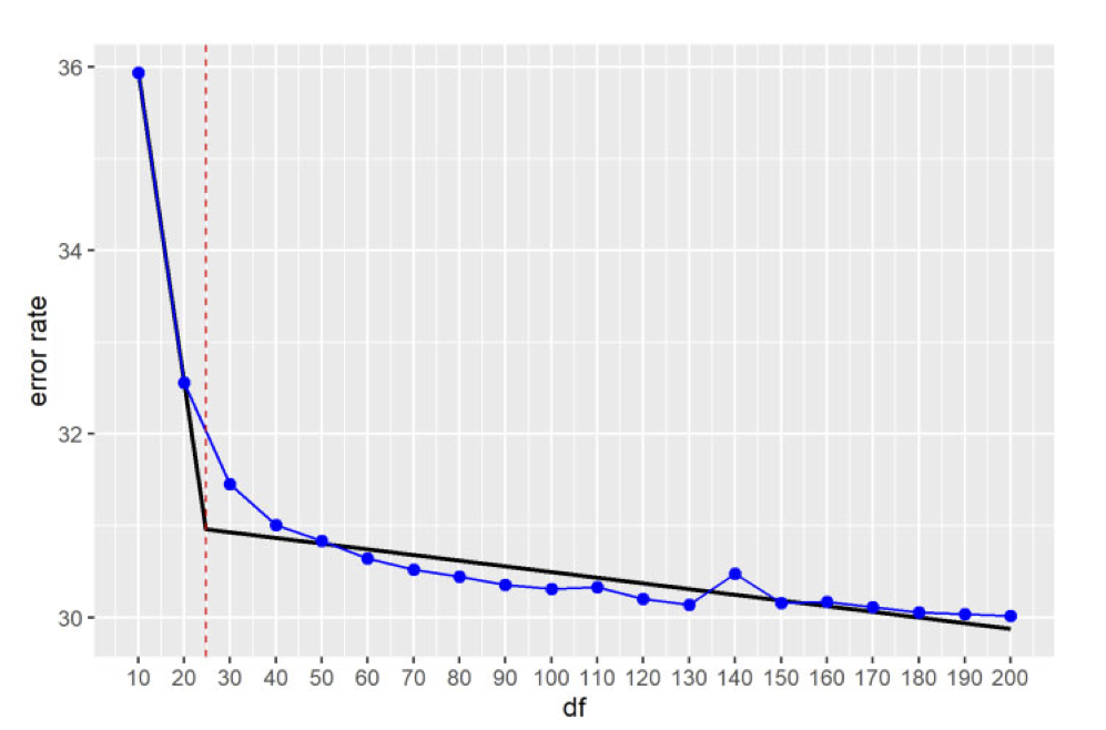 \[ \hat{\sigma}^2 = \frac{1}{p-k} \sum_{i=k+1}^p d_i^2 \]