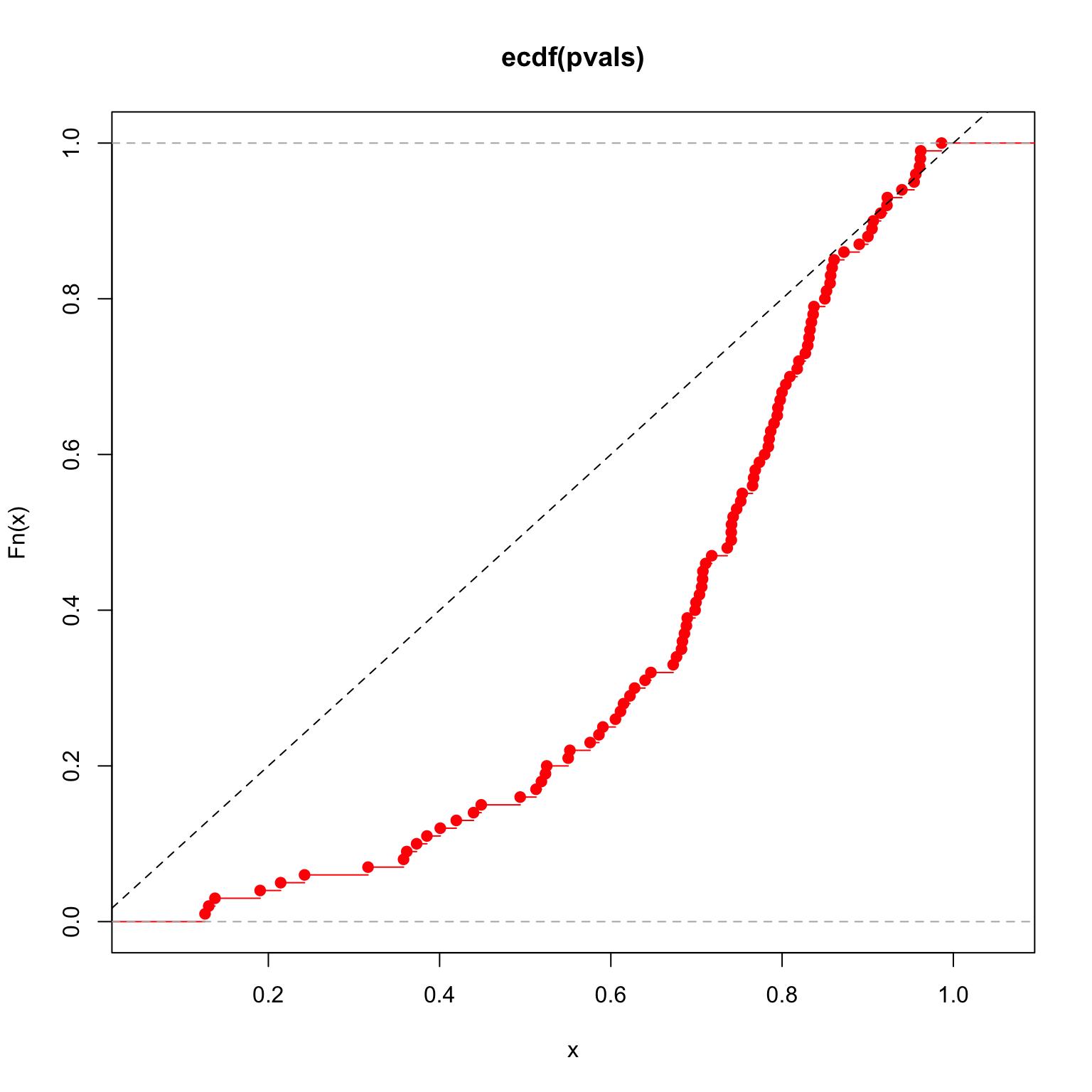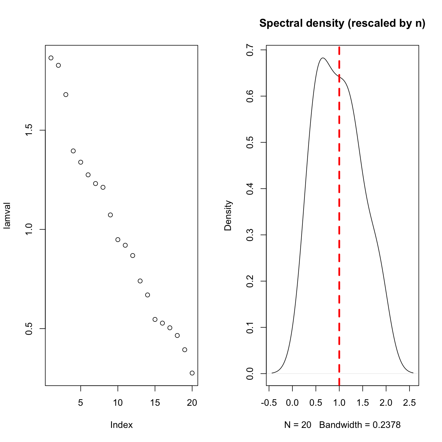 pWishartMax(eigvals_hat[1], nrow(X) - 1, ncol(X), var=noise_level, lower.tail=FALSE)[1] 0.1194141