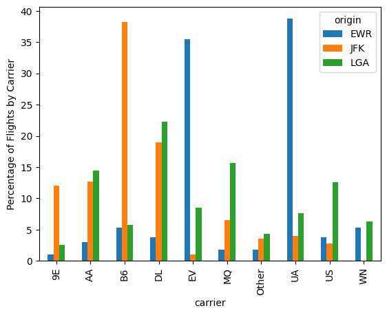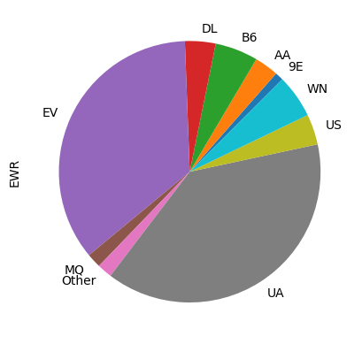 Here is a pie-chart showing the distribution of carrier for the flights that left from JFK airport
