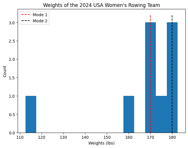 \(\displaystyle 115, 160, \underbrace{170, 170, 170}_{\text{mode 1}}, 175, \underbrace{180, 180, 180}_{\text{mode 2}}\)
