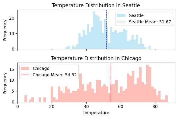 Recounting the example from lecture 5, below are the overlayed histograms of daily average temperatures in two cities in 2024-2025.